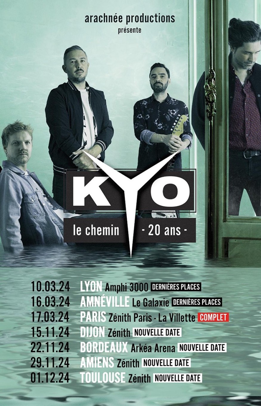 Idole de toute une génération, Kyo annonce son grand retour sur scène. Le groupe se produira ainsi à travers la France en 2024 afin de défendre ses nouveaux titres mais aussi de fêter les 20 ans de la sortie de l’album Le Chemin.